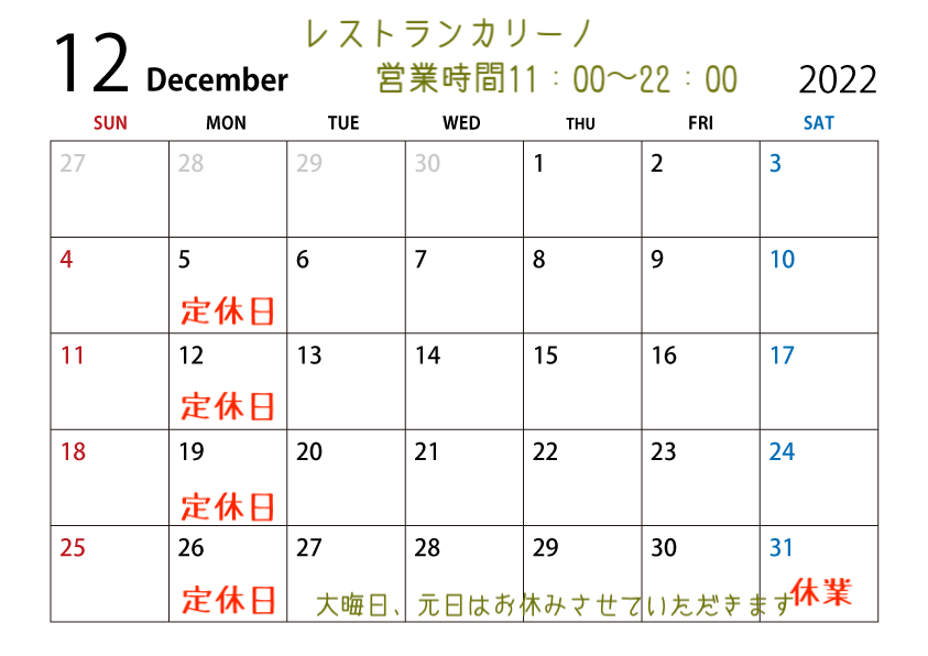 月曜日定休日(祝日は営業)の他12月31日(土)1月1日(日) 17日(火)お休みさせていただいます。よろしくお願い申し上げます。